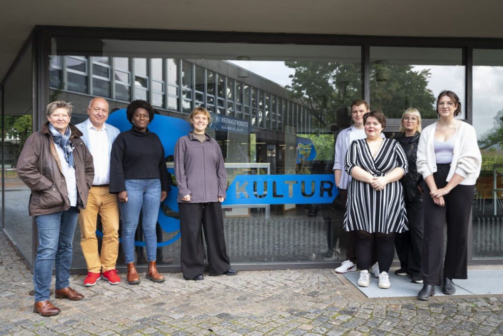 Auf dem Foto von links nach rechts: Frau Schrader (Geschäftsführung des Studentenwerks Schleswig-Holstein), Herr Prof. Dr. med. Schreiber (Leitung des Exzellenzclusters PMI und Direktor der Klinik für Innere Medizin des UKSH Kiel), Frau Avevor (Doktorandin am IKMB und Humanmedizinstudentin an der CAU), Charlotte Stenzel (Initiative Kultur im Sechseckbau), Jonas Richter (Vorstand des Campusradio), Eva-Maria Wölfel (Vorstand des Campusradio), Lea-Marie Lopau (Vorstand des AStA), Meret Maier-Wörz (Leitungsteam des studentischen Wintermärchens “Robin Hood”); Foto: Dietmar Fiedler.